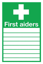 The sign informs staff of the names of the first aiders on site in case of an accident or emergency. The 300x200mm sign includes space for names, contact numbers and locations of first aiders. The universal green and white colour scheme instantly categorises this as a safety sign on sight, keeping employees informed and safe at work. The tough PVC sign can be affixed easily to walls, doors and any other surfaces.
