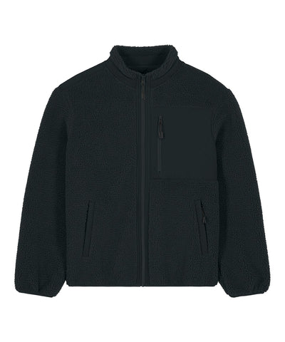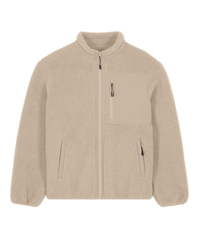 Premium unisex Sherpa jacket in 100% recycled polyester. Relaxed fit, 450gsm. Fully bonded inside fleece layer with an anti-pill finish. Contrast softshell inserts.