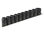 The set contains 10 regular metric ½ inch drive 6-point impact sockets supplied on a clip rail. These sockets are ANSI standard and are suitable for automotive use.