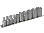 The Teng 10-piece 1/4 and 3/8 inch drive TX-E socket set is supplied on a clip rail. The sockets are made from chrome vanadium steel with a satin finish.