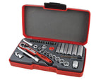 This T1436 1/4 inch drive metric socket set comprises 36 pieces, which are supplied in a plastic carrying case which has a snap lock lid and metal pin hinges.